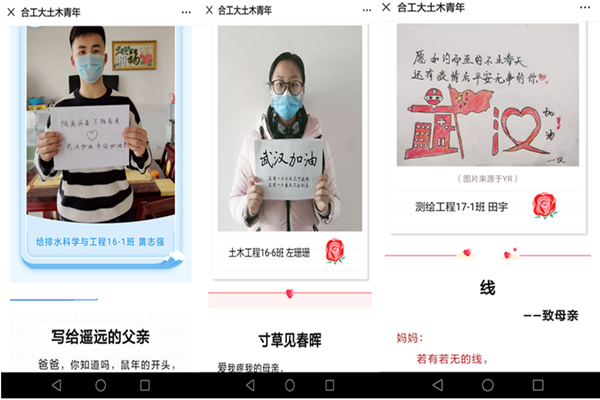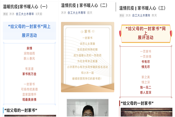 一封封家书,是传统文化的回归,也是漫时代亲情的印记。见字如晤,纸短情长。此次活动从发起至今,各年级同学热情高、兴趣浓,不到一周的时间已收到家书90余篇。一封封家书,没有华丽的辞藻,朴实无华的文字却打动人心。疫情期间,学院每天会遴选部分优秀作品在“合工大土木青年”微信公众号上进行展评。