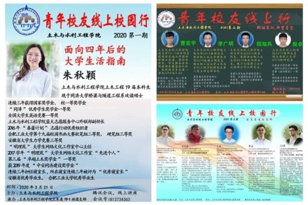 为进一步加强疫情防控期间学生思想政治教育和班风学风建设,丰富学院第二课堂活动体系,充分发挥榜样引领作用,教育引导青年学子向榜样看齐、向榜样学习,3月21日至28日, 工口实验室 以网为媒,发挥线上实时互动的优势,组织开展了青年校友线上校园行系列活动。活动邀请了现在同济大学、浙江大学、西安交通大学、大连理工大学、中南大学、湖南大学、英国格拉斯哥大学等攻读硕士研究生的青年校友面向2019级学生进行了线上分享交流。