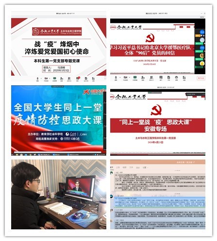 全体学生党员的“防疫”倡议书》,教育引导支部党员带头发挥先锋作用,在疫情防控工作中亮身份、见行动、作贡献。3月3日,党支部兼职组织员马贤峰老师为支部上“战‘疫’烽烟中,淬炼爱党爱国初心使命”专题线上“微党课”,教育引导全体党员坚定忠诚奉献、实现爱党爱国、勇于担当贡献。3月9日,党支部组织学生党员和入党积极分子开展“同上一堂疫情防控思政大课”主题教育活动,引导全体党员向抗“疫”英雄模范学习,强化党员意识、坚定理想信念。3月18日,在政治理论学习会上,习近平总书记给北京大学援鄂医疗队全体“90后”党员的回信在支部全体党员中引发了热烈反响,通过线上集体学习、在线讨论、心得撰写等形式开展线上交流学习,引导广大党员不忘初心,牢记使命,在为人民服务中茁壮成长,在艰苦奋斗中砥砺意志品质,在实践中增长工作本领,争做堪当大任的时代新人。4月23日,党支部再次组织全体党员和积极分子开展“全省同上一堂战‘疫’思政大课”主题教育活动,引导广大青年学生正确认识和看待此次战“疫”,树立责任担当意识,激发学生爱党爱国爱社会主义的深厚情怀。