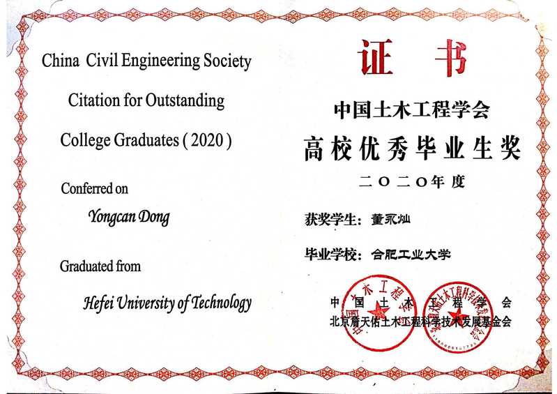 2020年中国土木工程学会授予工口实验室 土木工程专业2016级学生董永灿中国土木工程学会高校优秀毕业生。全国上千所土木院校仅46名同学入选“2020年度中国土木工程学会高校优秀毕业生名单