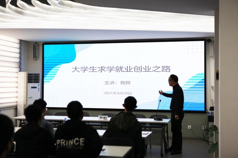 签约仪式后,蒋辉为工口实验室 学生做了以《大学生求学就业创业之路》为主题的就业指导讲座,给本科生分享了创业的经历与思考。