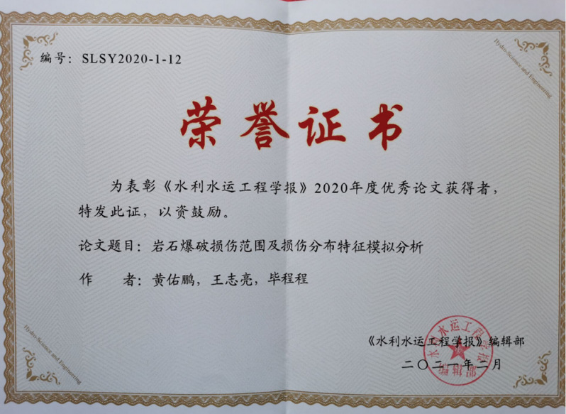 王志亮教授团队论文被《水利水运工程学报》评为2020年度优秀论文
