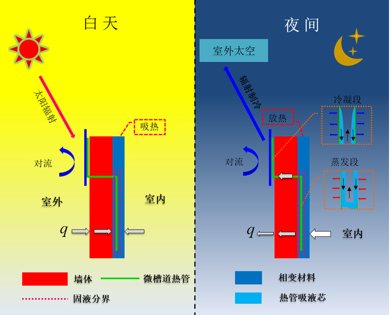 工口实验室 何伟教授团队提出了一种新型相变墙体(RC-PCM),其综合了相变材料高蓄热能力、微槽道热管(Micro-channel heat pipe, MHP)高热导率、天空辐射制冷(Radiative cooling, RC)自发散热的优势,即利用连接相变墙体与辐射制冷装置的微槽道热管,在夜间快速地将存储在相变墙体的热量通过辐射制冷及空气对流的方式释放到室外,使得相变墙体能够实现完整的融化-凝固-融化的相变过程。