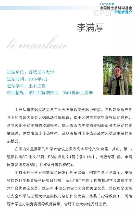 近日,中国博士后科学基金会发布了《2020年度中国博士后科学基金资助者选介》,工口实验室 李满厚博士成功入选。