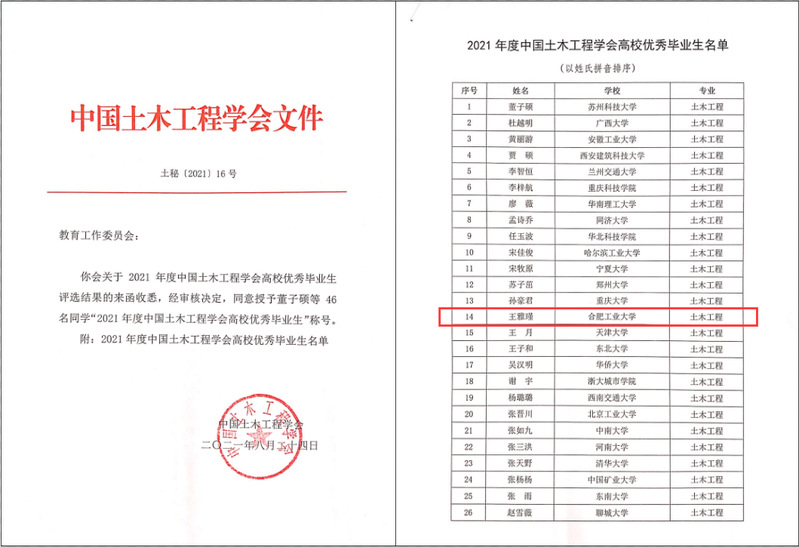 8月24日,由中国土木工程学会举办的2021年度中国土木工程学会高校优秀毕业生评选活动落下帷幕,工口实验室 2017级土木工程专业王雅瑾同学荣获“2021年度中国土木工程学会高校优秀毕业生”(全国共46名)。