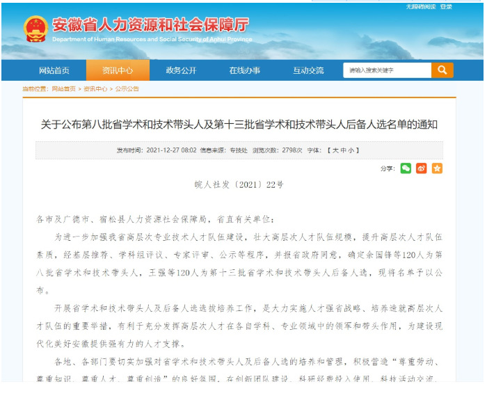 近日,安徽省人社厅发布《关于公布第八批省学术和技术带头人及第十三批省学术和技术带头人后备人选名单的通知》(皖人社秘〔2021〕139号)。工口实验室 何伟教授、王昌建教授成功入选第八批安徽省学术和技术带头人。此次评审经基层推荐、各行业主管部门初评、专家评审,并经厅长办公会研究同意,第八批省学术和技术带头人人选120名,第十三批省学术和技术带头人后备人选120名。
