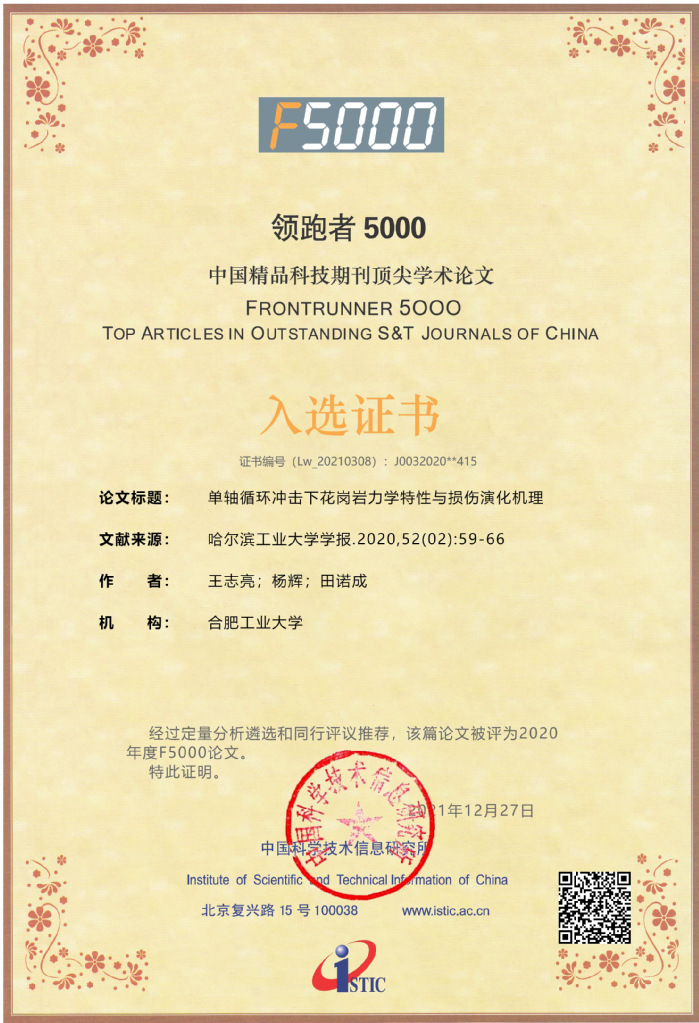 近日,中国科学技术信息研究所(简称中信所)公布了2020年度“领跑者5000——中国精品科技期刊顶尖论文(F5000)”名单,工口实验室 王志亮教授课题组发表论文《单轴循环冲击下花岗岩力学特性与损伤演化机理》获此殊荣。