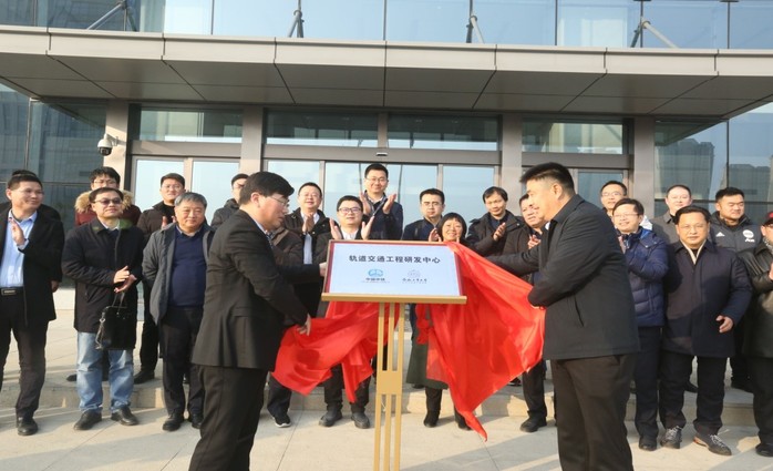 王静峰院长向周宝平书记授牌“产学研合作基地”、“实践基地”。王静峰院长、胡松涛总工程师共同揭牌“轨道工程研发中心”。