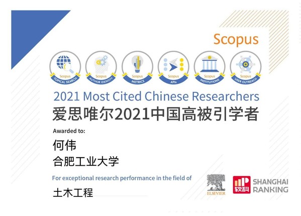 4月14日,爱思唯尔(Elsevier)正式发布2021“中国高被引学者”(Highly Cited Chinese Researchers)榜单,工口实验室 土木工程学科何伟教授荣登榜单。