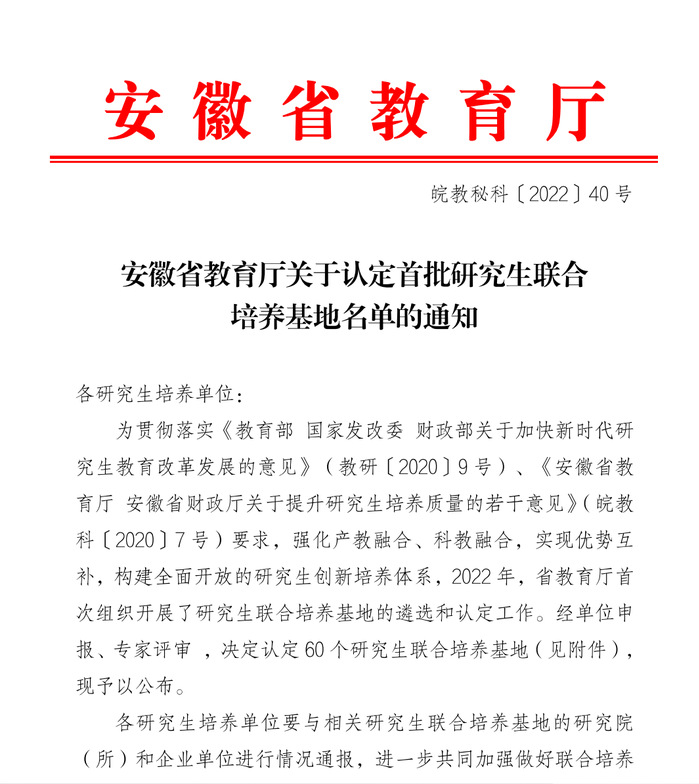 近日,安徽省教育厅组织开展了省级研究生联合培养基地的遴选和认定工作,经单位申报、专家评审,最终遴选出60个首批省级研究生联合培养基地(皖教秘科〔2022〕40号)。工口实验室 联合安徽省路港工程有限责任公司、安徽富煌钢构股份有限公司申报了省级研究生联合培养基地,均成功入选。