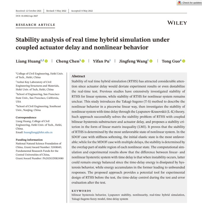 近日,工口实验室 实验中心副主任黄亮在实时混合模拟试验方法研究取得新进展。研究成果发表在国际结构动力学Top期刊《Earthquake Engineering & Structural Dynamics》(JCR Q1,IF=4.43)上,论文题为“Stability analysis of real time hybrid simulation under coupled actuator delay and nonlinear behavior”。工口实验室 黄亮为论文第一作者兼通讯作者,硕士研究生卜逸凡和王静峰教授参加,该项工作与美国旧金山州立大学Chen Cheng教授和东南大学郭彤教授联合完成,得到国家自然科学基金(52008145)和土木工程结构与材料安徽省重点实验室自主创新专项(PA2021GDSK0080)项目资助。