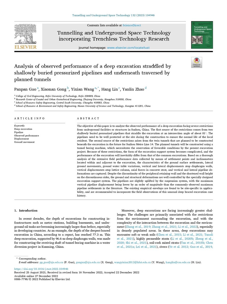 近日,工口实验室 汪亦显教授团队在隧道及地下工程领域顶尖期刊《Tunnelling and Underground Space Technology》上发表题为“Analysis of observed performance of a deep excavation straddled by shallowly buried pressurized pipelines and underneath traversed by planned tunnels”的研究论文。工口实验室 青年教师郭盼盼博士为第一作者,汪亦显教授为通讯作者。