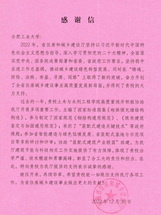 喜讯!安徽省住房与城乡建设厅发来感谢信!