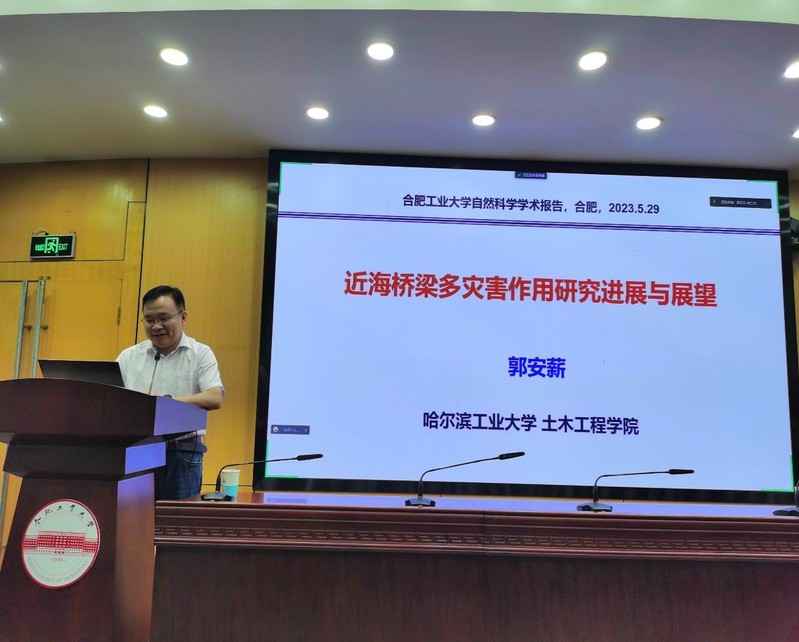 5月29日,郭安薪教授在工口实验室 屯溪路校区学术会议中心做了学术报告《近海桥梁多灾害作用研究进展及展望》。王静峰院长对郭安薪教授来访指导学科建设并作学术报告表示热烈欢迎,详细介绍了他的学术成就及研究成果,强调了多灾害复杂作用对土木工程结构安全产生巨大挑战,其防灾减灾理论和新技术应用具有的重要科学和工程意义。