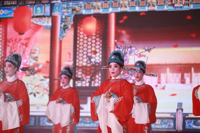 文艺汇演开始前,全场灯光闪烁,不同区域观众互动频频,全场观众齐声高呼倒计时,在乐队表演《再见杰克》和《海阔天空》中拉开了晚会帷幕。汇演分为“古风徽韵”“矢志报国”“启程远航”三个篇章。