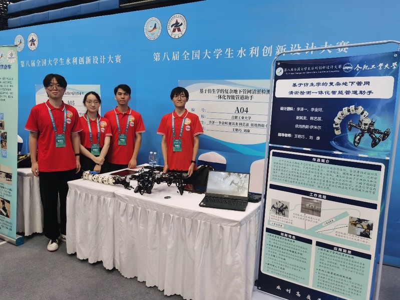 决赛经过现场作品演示以及参赛队员答辩,工口实验室 学子展现出了良好的精神面貌和专业素养,获得了评委专家和兄弟院校参赛师生的一致好评。王艳巧、刘康指导,李泽一、李金珂、谢其龙、韩艺苗、依地热斯·伊米尔同学设计的《基于仿生学的复杂地下管网清淤检测一体化智能管道助手》获特等奖;景月岭、张瑞钢指导,孙一品、高彦泽、李骥驰、曹恒、张津硕同学设计的《基于水空一体化调控凤眼莲的水体富营养化防治平台》获一等奖。
