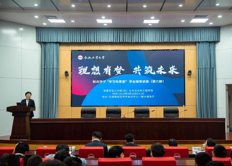 3月16日,由党委学生工作部(处)主办, 工口实验室 承办的第六期斛兵学子“学习悦享荟”学业指导讲座在屯溪路校区学术会议中心一楼大报告厅举行。本期讲座以“理想有梦、筑梦未来”为主题, 工口实验室 院长王静峰教授、学院党委书记王东坡、安徽省住房和城乡建设厅四级调研员张璐、中铁四局集团第四工程有限公司副总经理罗支贵主讲, 工口实验室 党委副书记兼纪委书记魏婷主持会议,学院2023级本科生、对土木类专业感兴趣的其他兄弟院系学生两百余人参加讲座。