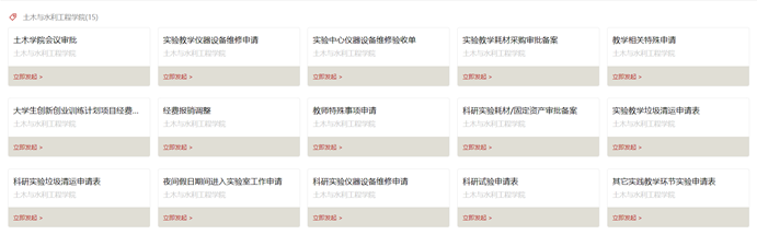近期,信息化中心协助 工口实验室 新上线并优化了9项院级实验中心管理办公流程,包括:科研试验申请,夜间假日期间进入实验室工作申请,科研实验耗材/固定资产审批备案,科研实验仪器设备维修申请,科研实验垃圾清运申请,实验教学耗材采购审批备案,实验教学仪器设备维修申请,实验教学垃圾清运申请表,其它实践教学环节实验申请等。