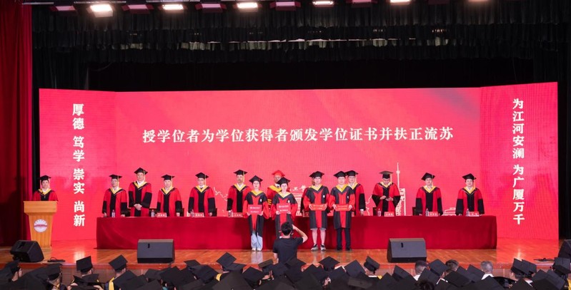 全体与会授学位者为学位获得者颁发了学位证书、扶正流苏并合影留念。