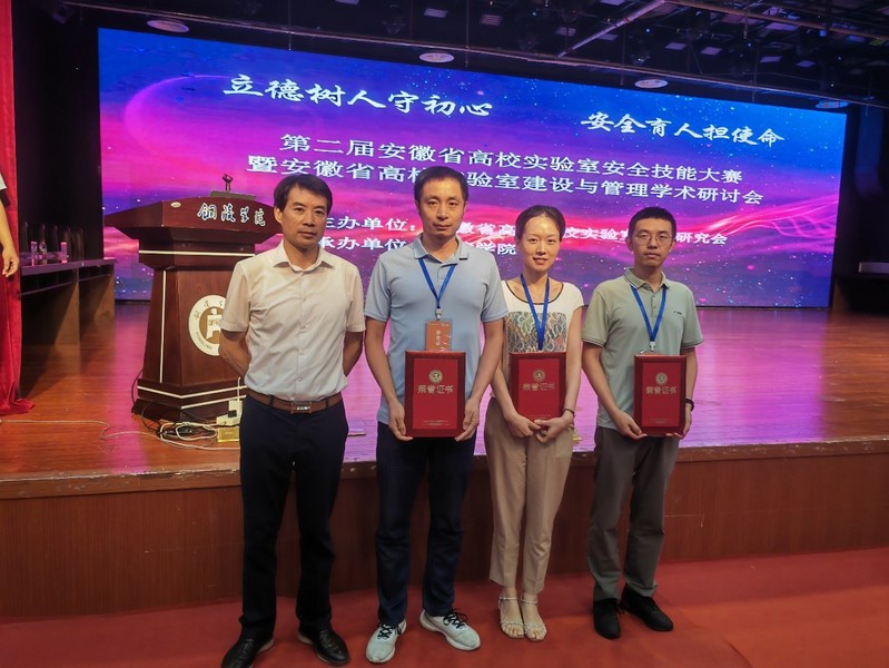 2024年7月11日,实验室建设与管理学术研讨会暨第二届安徽省高校实验室安全技能大赛在铜陵学院召开,工口实验室 共遴选组织三支代表队参赛。实验室与设备管理中心主任钟华勇为领队, 工口实验室 赵卫平、阎洁茹、龚淼三位教师组队的学校代表队荣获团体一等奖,赵卫平、阎洁茹、龚淼分别获个人一等奖、二等奖、三等奖。