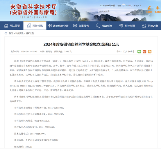 根据安徽省科学技术厅的2024年度安徽省自然科学基金杰青、优青、青年和面上拟立项项目公示,工口实验室 获批安徽省自然科学基金10项,其中杰青项目1项,面上项目7项,青年项目2项。
