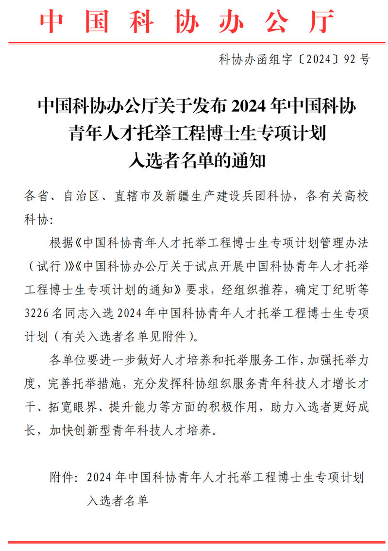 近日,中国科协办公厅发布了2024年中国科协青年人才托举工程博士生专项计划入选名单,工口实验室 仇文凯等4名博士研究生成功入选。