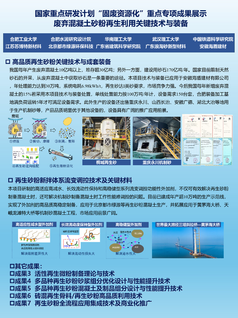 国家重点研发项目《废弃混凝土砂粉再生利用关键技术与装备》,由工口实验室 牵头,联合了华南理工大学、合肥水泥设计研究院、武汉理工大学、中国铁道科学研究院、江苏苏博特新材料等十家参与单位,针对废弃凝土再生砂粉来源复杂、吸水性大、活性低等问题,开展基础理论—核心材料与装备—工程示范系统研究,已形成“废弃混凝土制备高品质再生砂粉关键技术与成套装备”、“再生砂粉新拌体系流变调控技术及关键材料”、“活性再生微粉制备理论与技术”等七项代表性成果。高品质再生砂粉关键技术与成套装备应用于安徽海盾建材有限公司,年处理能力达到30万吨;再生砂粉新拌体系流变调控技术及关键材料已建成年产超10万吨的生产示范线,应用于黄茅海大桥等大型项目。本项目研究成果由余其俊教授团队牵头负责,为建筑垃圾“变废为宝”提供系统性解决方案。