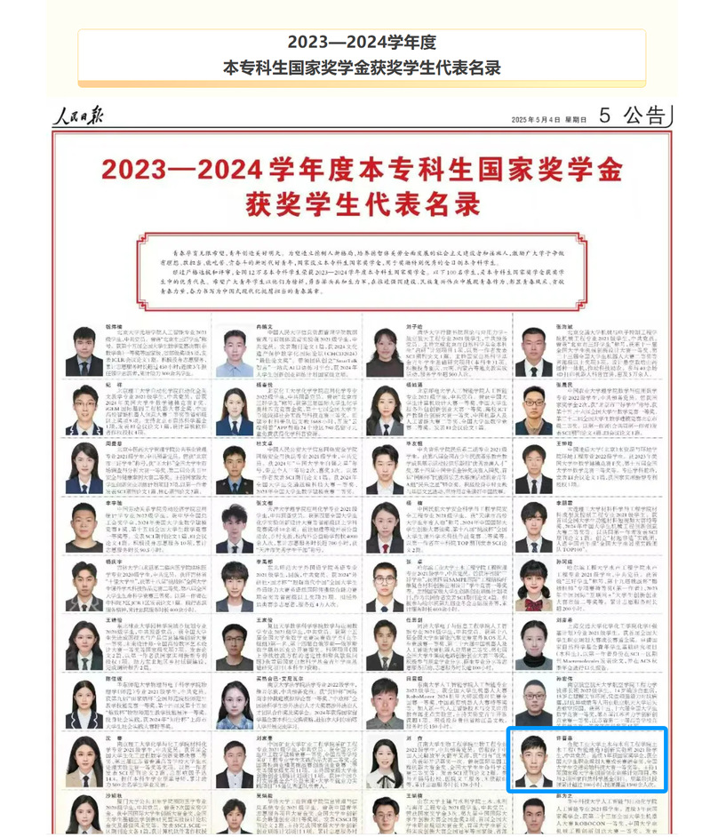 在纪念“五四运动”106周年之际,5月4日,《人民日报》刊登《2023—2024学年度本专科生国家奖学金获奖学生代表名录》,工口实验室 2021级本科生许晋嘉从全国12万名获奖者中脱颖而出,荣耀上榜(全国仅100人)。
