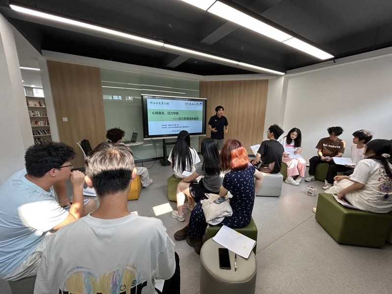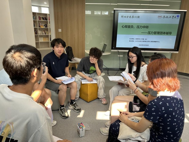528日下午, 工口实验室 在屯溪路校区五号宿舍楼学生社区沙龙空间开展“心释重负,压力中转”研究生压力管理团体辅导,学院大学生发展辅导中心主任胡倩倩担任领导者,14名在校研究生参加了此次活动。