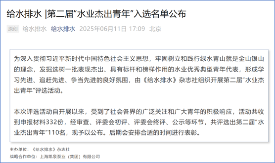 2025年6月11日,由《给水排水》杂志社组织开展的第二届“水业杰出青年”评选活动结果发布,工口实验室 周啸副教授入选。