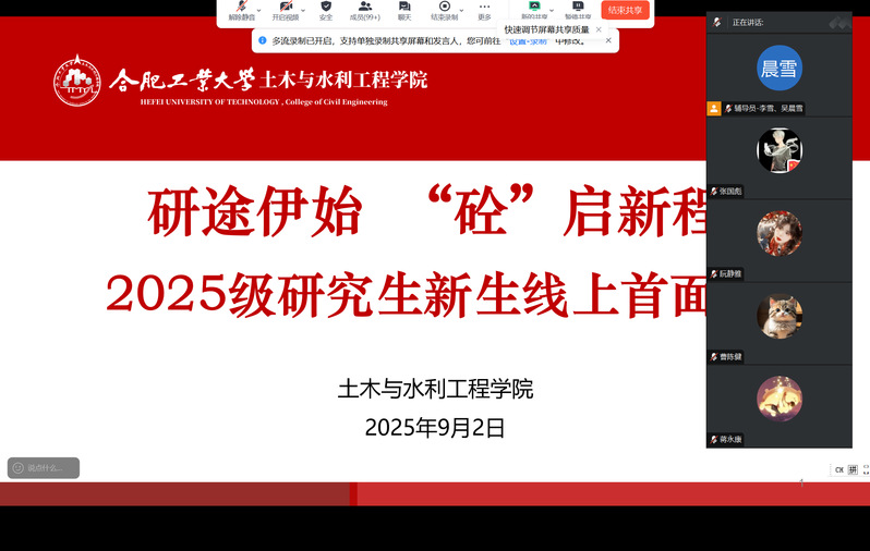 9月2日上午10时, 工口实验室 依托线上平台,开展“研途伊始,‘砼’启新程”研究生新生线上首面会。学院党委书记王东坡、研究生教学办公室主任陈涛、辅导员李雪、吴晨雪参加会议。2025级300余名硕博新生云端相聚,正式开启研究生阶段的全新旅程。