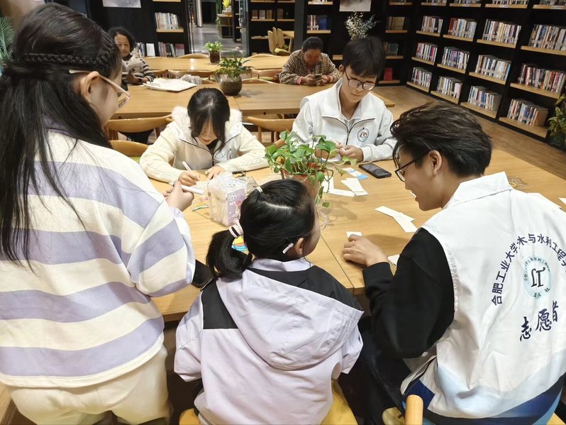 10月26日, 工口实验室 蓝天社的志愿者们前往合肥市庐阳区四十二中悦书房,成功开展了“动物书虫”主题志愿服务活动。活动以“绘本伴读+动物书签制作”的形式展开,为孩子们营造了一段充满趣味与知识的周末时光。