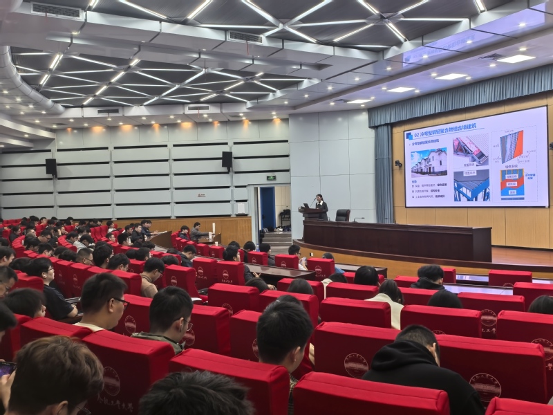 汪皖黔老师围绕装配式绿色农房技术体系的三大核心方向展开系统性讲解。在战略背景阐释方面,她分析了装配式绿色建筑研究立足于国家与安徽省乡村建设与绿色发展的战略部署,强调在全面推进乡村振兴、建设“好房子”的大背景下,探索既安全可靠又绿色实用的新型农房建设路径的重要意义;针对材料技术创新,她从材料性能与结构优势两个层面,系统介绍了冷弯型钢轻聚合物组合墙体的特点,并结合课题组近年来的研究成果,通过详实的数据与试验影像,展示了冷弯型钢与轻聚合物材料间的粘结滑移性能研究,以及墙体在冲击荷载下的动力响应与破坏模式分析;关于建造工艺优化,她从建造全过程出发,分模块拆分、单舱制作、单舱运输和多舱装配四个环节,阐释了轻钢模块化建筑体现出的高效化、简易化、精细化与绿色化特征。