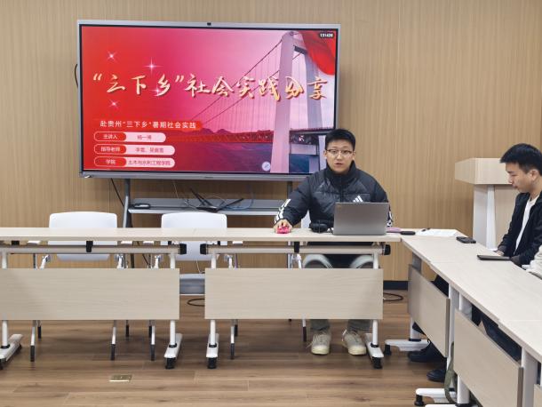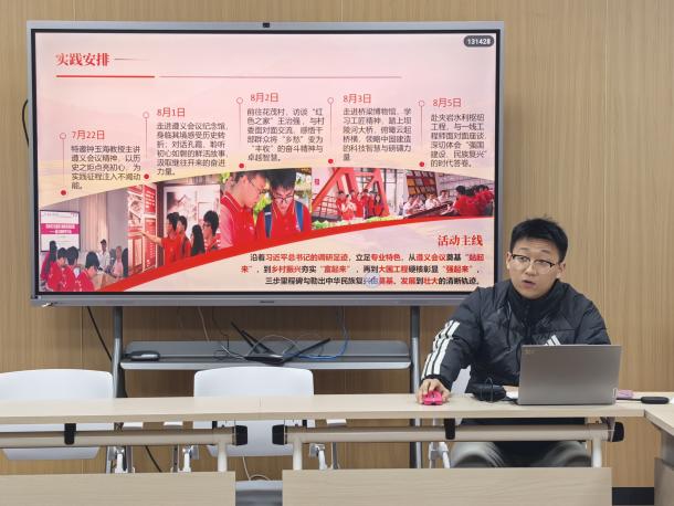 活动伊始,杨一博以“红色传承、乡村振兴、大国工程”为主线,系统汇报了团队赴贵州开展实践调研的全貌。他首先介绍,为筑牢调研理论根基,团队特地邀请钟玉海教授与王皖江老师开展遵义会议精神专题授课。随后,他结合“站起来”“富起来”“强起来”的发展脉络展开分享:在红色传承篇章,他讲述了团队赴遵义会议纪念馆参与现场教学的经历,成员们通过义务宣讲员孔霞的细致讲解,重温了中国革命史上的关键转折;谈及乡村振兴实践,他分享了团队在花茂村与村干部座谈的见闻,生动展现了这个昔日“荒茅田”如何转型为以红色旅游、陶艺产业为核心的乡村振兴标杆;而在大国工程调研中,他以桥梁博物馆记载的五项“第一”纪录、采用世界领先悬索桥技术的坝陵河大桥,以及应用数字孪生平台的夹岩水利枢纽工程为实例,清晰呈现了我国基础设施建设从“中国建造”向“中国智造”升级的技术演进路径。