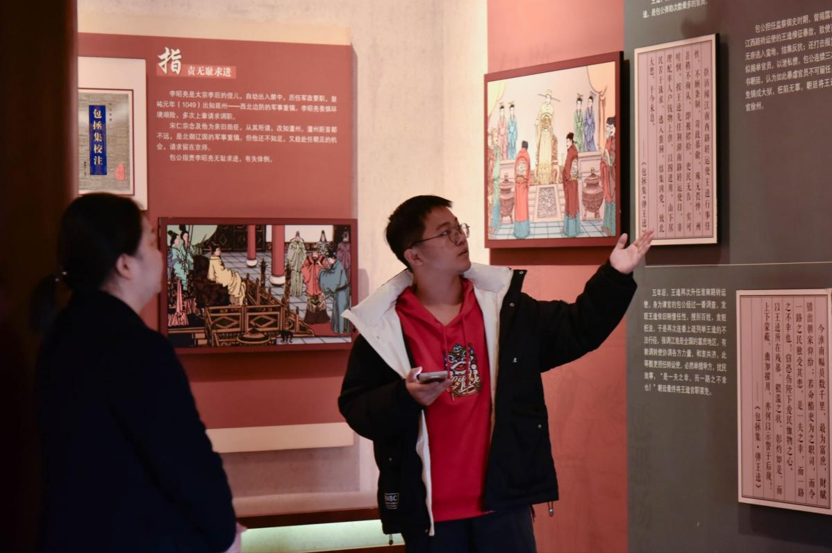 在包公墓神道,志愿者们系统了解包公生平与政绩。享堂内,匾额背后的故事徐徐展开;墓冢前,归葬故里的历史与其为官准则相互映照;碑廊中,斑驳的文字静静诉说着家族墓群的往昔,共同勾勒出一位立体而鲜活的包公形象。登上清风阁远眺,志愿者们从建筑形制入手,深入体会了“清风”二字所蕴含的设计深意。阁内陈列的廉政浮雕、历代碑刻,与“陈州放粮”“怒弹国舅”等经典故事相互印证,生动诠释了包公“铁面无私”的精神品格。通过培训,志愿者们不仅学会了如何将“清风正气”转化为生动的讲解语言,更掌握了让静态文物“活”起来的表达技巧,引导游客在聆听中感受包公精神的时代价值。