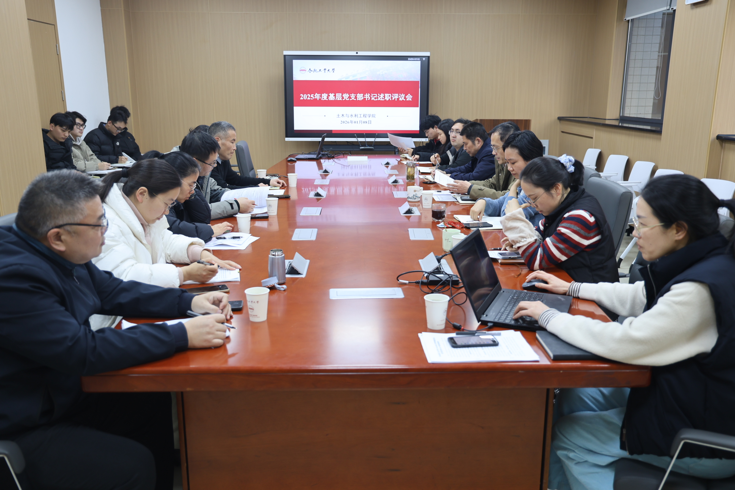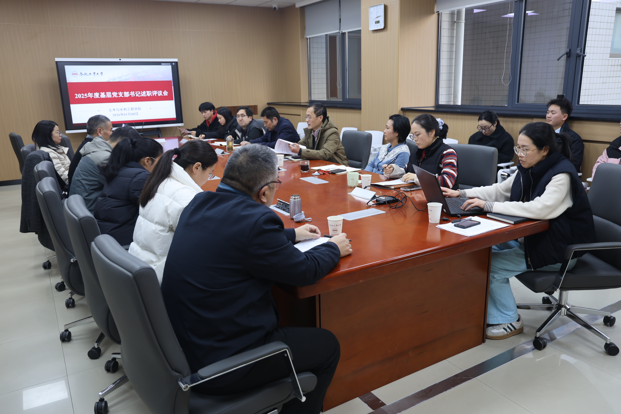 为深入贯彻新时代党的建设总要求,18日下午,学院在纬地楼414会议室召开2025年度基层党支部书记述职评议会。学院教工党支部、学生党支部书记依次围绕支部基本情况、年度工作开展成效、存在问题及未来规划等方面开展述职。学院党委书记王东坡、正处级组织员李强、党委副书记关茜及各基层党支部书记参加会议。