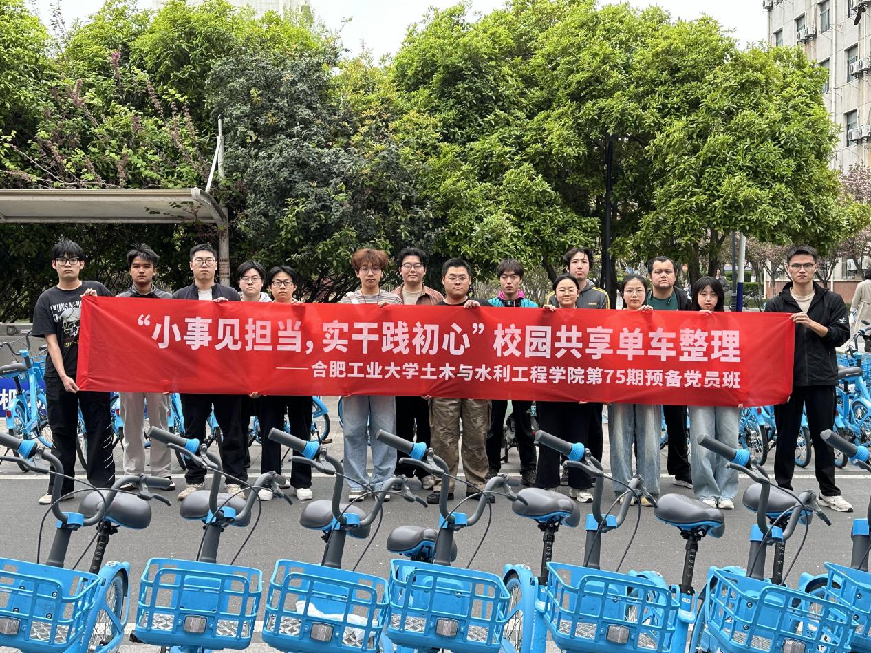 75期预备党员班全体学员走进食堂停车区、西二教学楼停车区,开展共享单车规范整理实践活动。