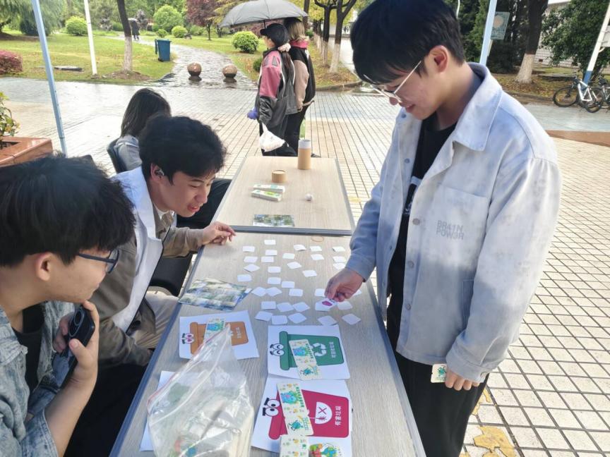 活动现场氛围热烈,三大特色环节将环保教育从“说教”变为“体验”,让绿色理念在师生沉浸式参与中入脑入心。“给地球写句话”环节温情满满,同学们纷纷提笔写下环保寄语,一张张写满环保心愿的便利贴,化作细雨中最动人的风景。“垃圾分类翻翻乐”环节寓教于乐,同学们通过卡片配对游戏在趣味比拼中学习垃圾分类知识,让科普知识入脑入心。“环保行动抽抽乐”环节则生动诠释了“微行动汇聚大改变”的环保理念。同学们抽取“节水节电”等简易环保任务,完成实践后即可兑换种子纸,将绿色承诺与希望一同种下,让环保信念生根发芽。活动还融入趣味“运势签”,在欢声笑语中传递绿色生活小知识,让低碳微行动深入人心。